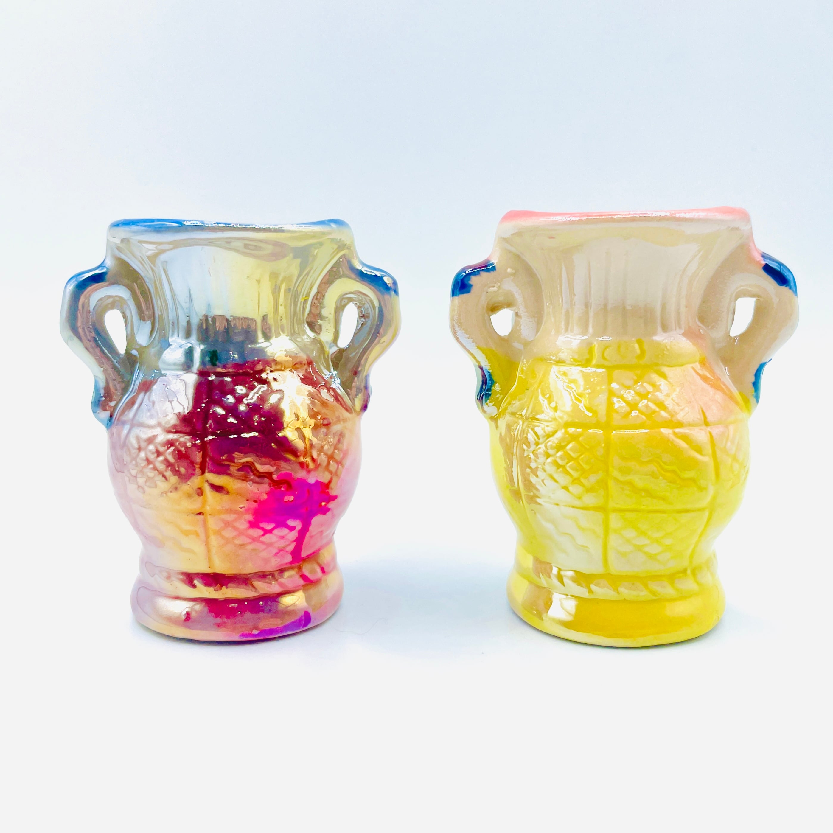 ツヤツヤしたオーロラのような色合いがレトロで可愛い、中国の小さい飾り花瓶です。