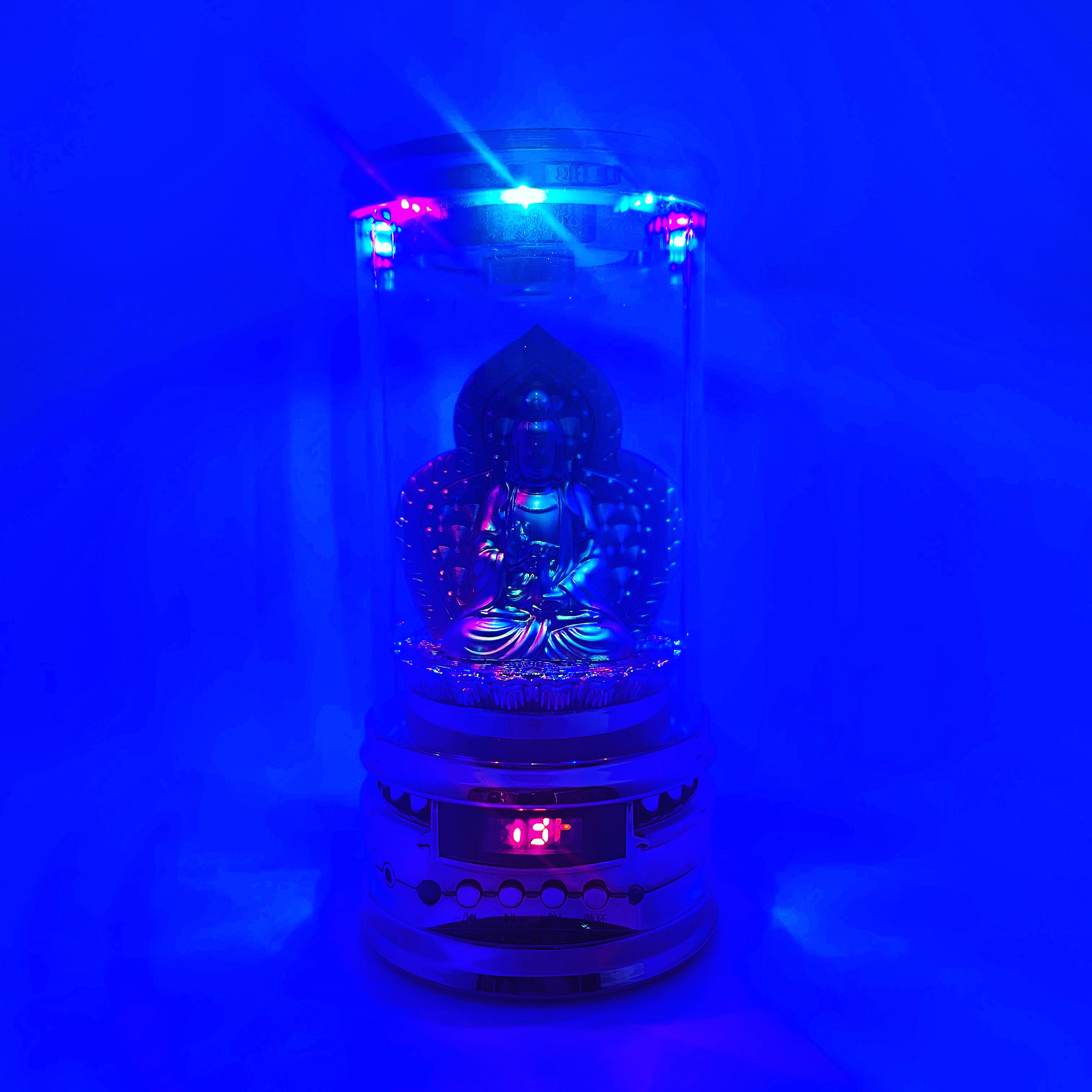 赤と青のLED電球が光って仏像を照らしてくれます。